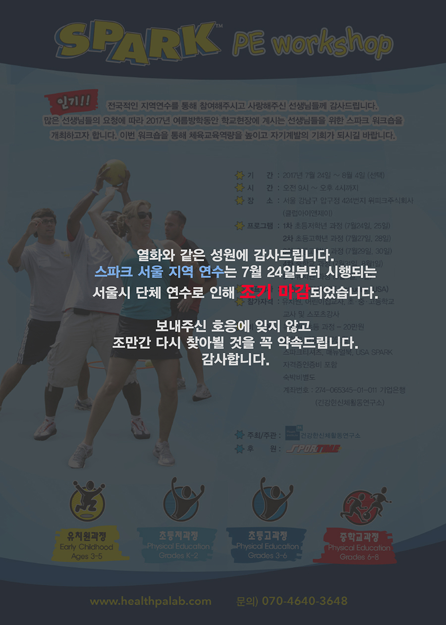 ÇÁ·Î±×·¥Àº À¯Ä¡¿ø °úÁ¤ºÎÅÍ ÁßÇб³ °úÁ¤À¸·Î ¼¼ºÐÈÇÏ¿© Á»´õ Àü¹®ÀûÀÌ°í ´Ù¾çÇÑ ÇÁ·Î±×·¥À» ±³À°¹ÞÀ» ¼ö ÀÖ½À´Ï´Ù. ¶ÇÇÑ ½ºÆ÷ŸÀÓÀÌ ÈÄ¿øÇÏ´Â À̹ø ¿öÅ©¼óÀº ½ºÆ÷ŸÀÓÀÇ 2017³â ½ÅÁ¦Ç°À» Ȱ¿ëÇÑ ÇÁ·Î±×·¥ ¿¬¼öµµ ÇÔ²² ÁøÇàÇÕ´Ï´Ù. Àü±¹ÀûÀ¸·Î ÁøÇàÇϰí ÀÖ´Â ½ºÆÄÅ© ÇÁ·Î±×·¥ ¿¬¼ö¿¡ Âü¿© ±âȸ°¡ ´êÁö ¸øÇß´ø ¼±»ý´Ôµé²²¼´Â À̹ø ±âȸ¸¦ ³õÄ¡Áö ¸¶½Ã±â ¹Ù¶ø´Ï´Ù! ¼¿ï Áö¿ª ¢º7¿ù 24ÀÏ(¿ù)ºÎÅÍ 8¿ù 4ÀÏ(±Ý)±îÁö ¢º1Â÷ - ÃʵîÀúÇг⠰úÁ¤ (7¿ù 24ÀÏ, 25ÀÏ) 2Â÷ - Ãʵî°íÇг⠰úÁ¤ (7¿ù 27ÀÏ, 28ÀÏ) 3Â÷ - Ãʵî°íÇг⠰úÁ¤ (7¿ù 29ÀÏ, 30ÀÏ) 4Â÷ - ÁßÇб³ °úÁ¤ (7¿ù 31ÀÏ, 8¿ù 1ÀÏ) 5Â÷ - À¯Ä¡¿ø °úÁ¤ (8¿ù 3ÀÏ, 4ÀÏ) ¢º¾Ð±¸Á¤µ¿ À§ÇÇÅ© º»»ç(Ŭ·´¾ÆÀÌ¿£Á¦ÀÌ) ´õ¿í ÀÚ¼¼ÇÑ »çÇ×Àº ¾Æ·¡ Æ÷½ºÅ͸¦ ÂüÁ¶ÇÏ¿© ÁÖ½Ã±æ ¹Ù¶ø´Ï´Ù.