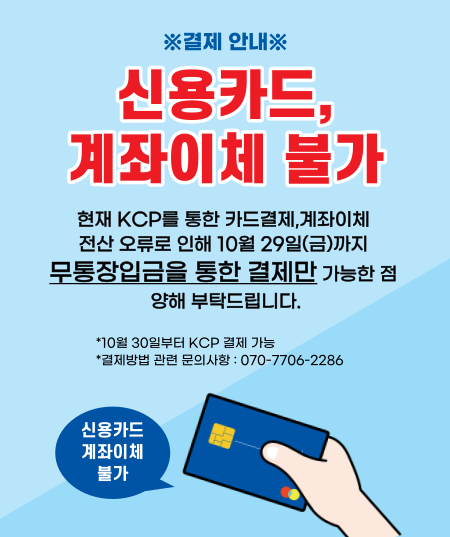 ![]() [°áÁ¦¿À·ù ¾È³»] ÇöÀç KCP¸¦ ÅëÇÑ Ä«µå°áÁ¦,°èÁÂÀÌü Àü»ê ¿À·ù·Î ÀÎÇØ 10¿ù 29ÀÏ(±Ý)±îÁö ¹«ÅëÀåÀÔ±ÝÀ» ÅëÇÑ °áÁ¦¸¸ °¡´ÉÇÑ Á¡ ¾çÇØ ºÎʵ右´Ï´Ù. * 10¿ù 30ÀϺÎÅÍ KCP °áÁ¦ °¡´É * °áÁ¦¹æ¹ý °ü·Ã ¹®ÀÇ»çÇ× : 070-7706-2286 |