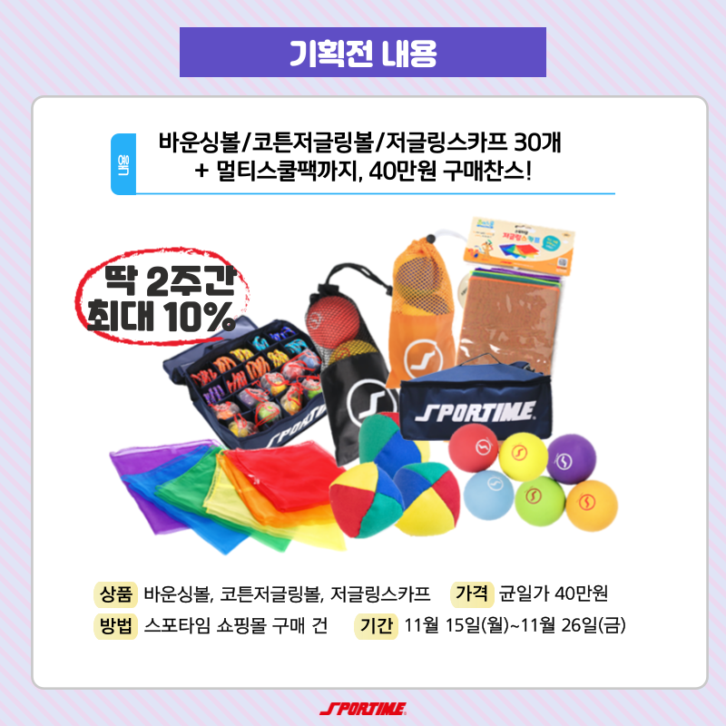 ¹æ¹ý : ½ºÆ÷ŸÀÓ¼îÇθô(www.sportimekorea.co.kr) ±¸¸Å °Ç ´ë»ó : Çб³ ¹× ÀϹÝȸ¿ø ´ë»ó ±â°£ : 11/15(¿ù) ~ 11/26(±Ý)±îÁö