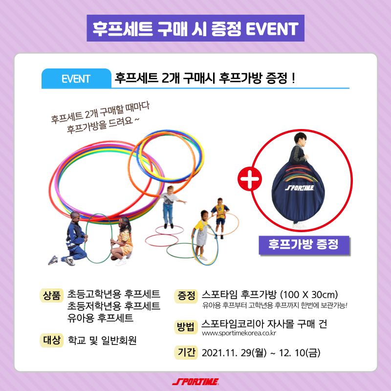 ¹æ¹ý : ½ºÆ÷ŸÀÓ ¼îÇθô ±¸¸Å°Ç (http://www.sportimekorea.co.kr) ´ë»ó : Çб³ ¹× ÀϹÝȸ¿ø ´ë»ó ±â°£ : 11/29 (¿ù) ~ 12/10 (±Ý)±îÁö