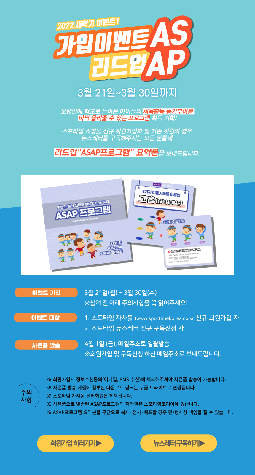 ½ºÆ÷ŸÀÓ¿¡¼´Â üÀ°¼ö¾÷ Àü °¡´ÉÇÑ »¡¸® ½Åü¸¦ Ȱ¼ºÈÇÒ ¼ö ÀÖ´Â ¸®µå¾÷ ºñ¹ýÀ» °¡Áö°í ÀÖÁÒ! ¹Ù·Î 'ASAP ÇÁ·Î±×·¥'ÀÔ´Ï´Ù. À̹ø »õÇбâ À̺¥Æ®·Î ¹Ù·Î ÀÌ ¸®µå¾÷ ºñ¹ý! ASAP ÇÁ·Î±×·¥ ¿ä¾àº»À» º¸³»µå¸®´Âµ¥¿ä. À̺¥Æ® Âü¿©¹æ¹ýÀ» ¾Ë¾Æº¼±î¿ä!? *À̺¥Æ® ±â°£ : 3/21(¿ù) ~ 3/30(¼ö) *À̺¥Æ® ´ë»ó : ½ºÆ÷ŸÀÓ È¨ÆäÀÌÁö ½Å±Ô°¡ÀÔÀÚ ¹× ´º½º·¹ÅÍ ½Å±Ô ±¸µ¶ÀÚ (µô·¯È¸¿ø Á¦¿Ü) *»çÀºÇ° ¹ß¼Û : 4/1(±Ý), ¸ÞÀÏÁÖ¼Ò·Î Àϰý¹ß¼Û ¡Ø ȸ¿ø°¡ÀÔ ¹× ±¸µ¶½Åû ÇϽЏÞÀÏÁÖ¼Ò·Î ÇÁ·Î±×·¥ ¿ä¾àº»À» ´Ù¿î¹ÞÀ» ¼ö ÀÖ´Â ¸µÅ©¸¦ º¸³»µå¸³´Ï´Ù. À̹ø »õÇбâ À̺¥Æ®¸¦ ÅëÇØ ¸®µå¾÷ ºñ¹ýµµ Àü¼ö¹Þ°í Á¤±âÀûÀ¸·Î üÀ° ¹× ±³À°Á¤º¸µµ ȹµæÇغ¸¼¼¿ä ~! |