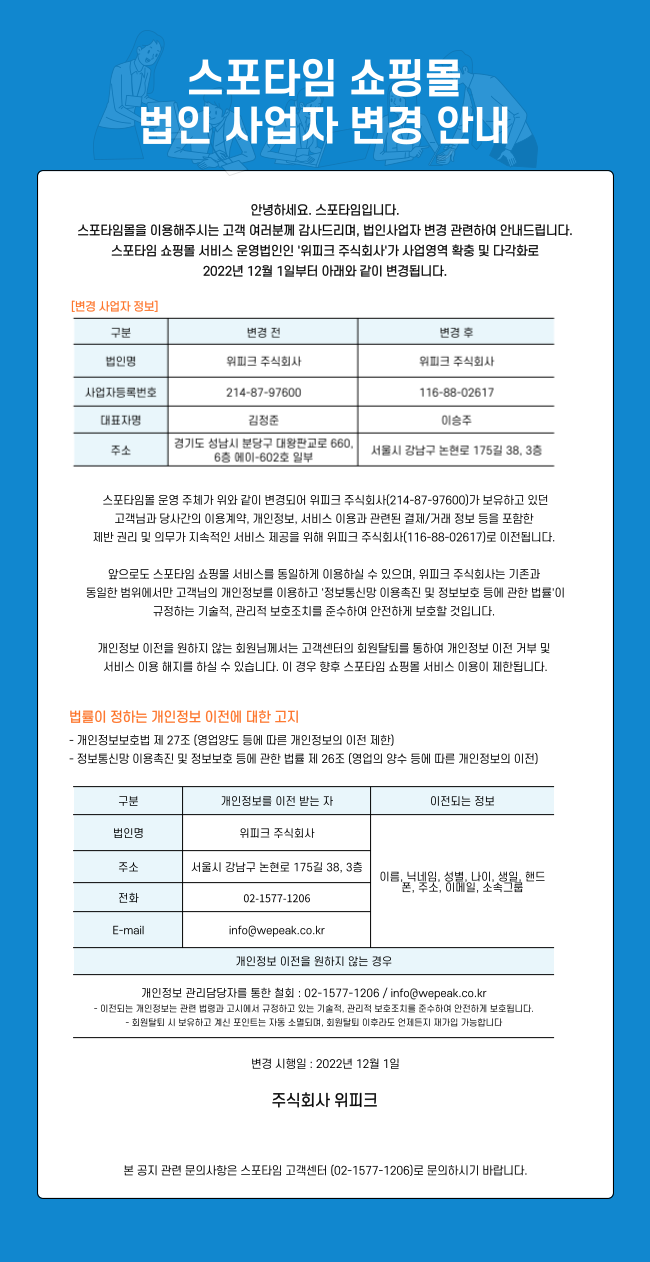 [°øÁö] ½ºÆ÷ŸÀÓ ¼îÇθô ¹ýÀÎ »ç¾÷ÀÚ º¯°æ ¾È³»