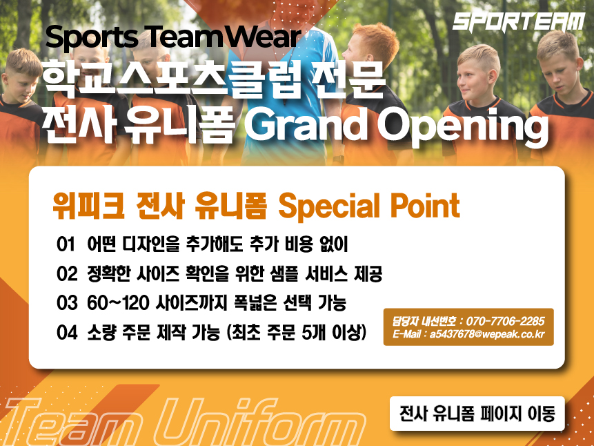 ![]() ½ºÆ÷Ã÷ ÆÀÀ» À§ÇÑ 'Ä¿½ºÅÒ ÆÀ ¿þ¾î' ¿ì¸® ÆÀ¸¸ÀÇ Ä÷¯¿Í µðÀÚÀÎÀ¸·Î ÆÀÀÇ '¾ÆÀ̵§Æ¼Æ¼¿Í °³¼º'À» ºÎ°¢Çغ¸¼¼¿ä. ´ã´çÀÚ ³»¼±¹øÈ£ : 070-7706-2285 E-mail : a5437678@wepeak.co.kr À¯´ÏÆû ÁÖ¹®¼ ¾ç½ÄÀº ÷ºÎÆÄÀÏÀ» È®ÀÎÇØÁÖ¼¼¿ä. |