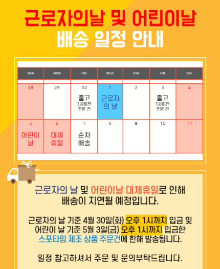 ![]() 5¿ù 1ÀÏ ±Ù·ÎÀÚÀÇ ³¯ 5¿ù 6ÀÏ ¾î¸°À̳¯ ´ëüÈÞ¹«·Î ÀÎÇØ ¹è¼ÛÀÌ Áö¿¬µÉ ¿¹Á¤ÀÔ´Ï´Ù. ±Ù·ÎÀÚÀÇ ³¯ ±âÁØ 4¿ù 30ÀÏ(È) ¿ÀÈÄ 1½Ã±îÁö ÀÔ±Ý ¹× ¾î¸°ÀÌ ³¯ ±âÁØ 5¿ù 3ÀÏ(±Ý) ¿ÀÈÄ 1½Ã±îÁö ÀÔ±ÝÇÑ ½ºÆ÷ŸÀÓ Á¦Á¶ »óǰ ÁÖ¹® °Ç¿¡ ÇÑÇØ ¹ß¼ÛµË´Ï´Ù. ÀÏÁ¤ Âü°íÇϼż ÁÖ¹® ¹× ¹®ÀÇ ºÎʵ右´Ï´Ù. °¨»çÇÕ´Ï´Ù. |
