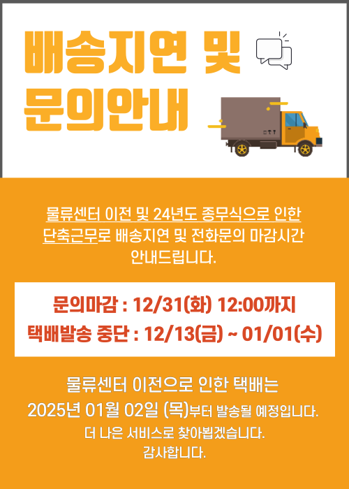 ![]() ¡Ø ¹è¼ÛÁö¿¬ ¹× ¹®ÀǸ¶°¨ ¾È³» ¡Ø ¹°·ù¼¾ÅÍ ÀÌÀü ¹× 24³âµµ Á¾¹«½ÄÀ¸·Î ÀÎÇÑ ´ÜÃà±Ù¹«·Î ¹è¼ÛÁö¿¬ ¹× Àüȹ®ÀÇ ¸¶°¨½Ã°£ ¾È³»µå¸³´Ï´Ù. ¹®ÀǸ¶°¨ : 12/31(È) 12:00±îÁö Åùè¹ß¼Û Áß´Ü : 12/13(±Ý) ~ 01/01(¼ö) ¹°·ù¼¾ÅÍ ÀÌÀüÀ¸·Î ÀÎÇÑ Åùè´Â 2025³â 01¿ù 02ÀÏ (¸ñ)ºÎÅÍ ¹ß¼ÛµÉ ¿¹Á¤ÀÔ´Ï´Ù. ´õ ³ªÀº ¼ºñ½º·Î ã¾ÆºË°Ú½À´Ï´Ù. °¨»çÇÕ´Ï´Ù. |