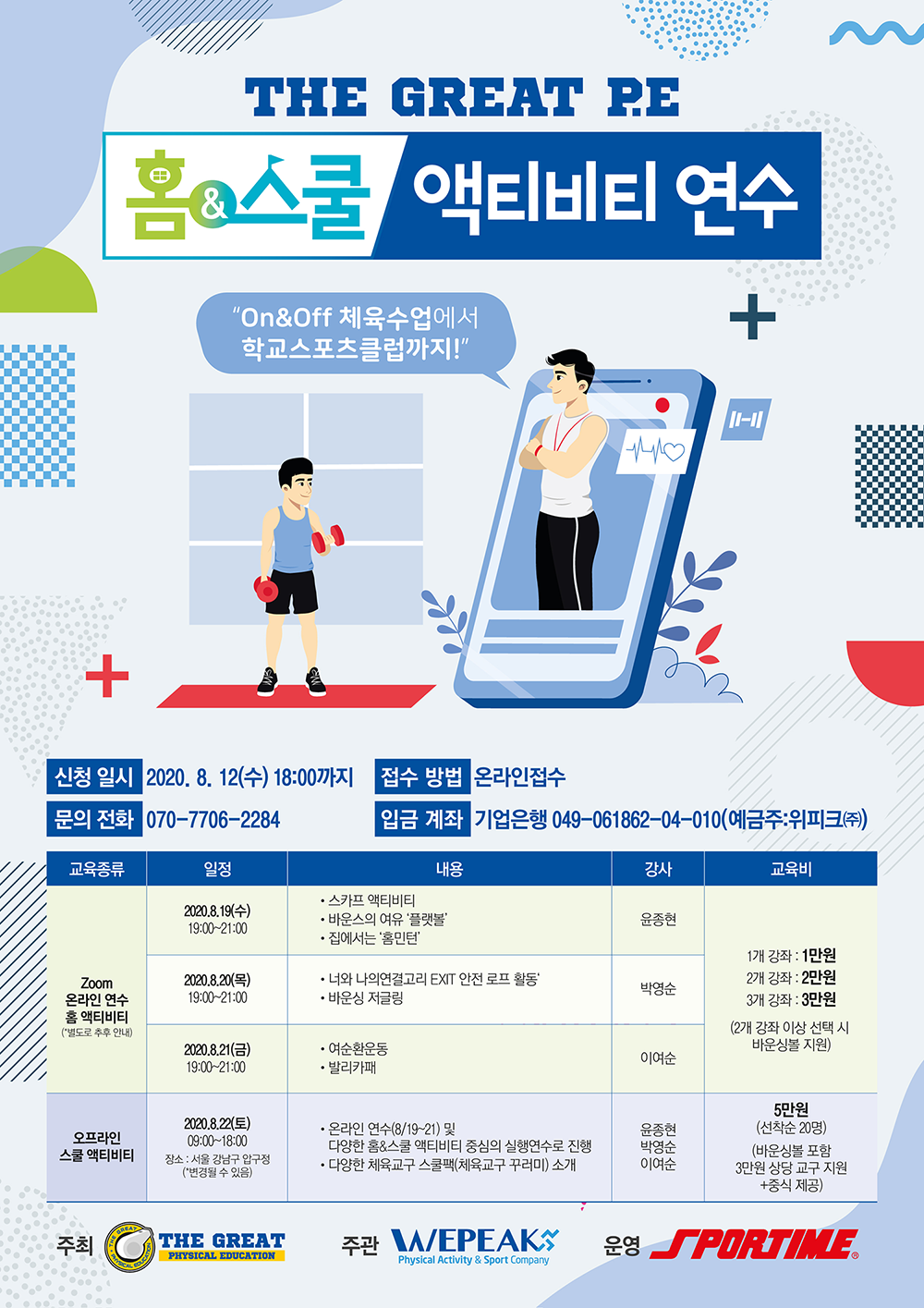 1. Zoom ¡®È¨ ¾×ƼºñƼ¡¯ ¿Â¶óÀÎ ¿¬¼ö ¡ÜÀϽÃ: 2020.8.19(¼ö)~21(±Ý) 19:00~21:00 ¡Ü¿Â¶óÀÎ Zoom ½Ç½Ã°£ ¿¬¼ö(Á¢¼Óurl ÃßÈÄ °øÁö) ¡Ü½ÅûÀοø: Á¦ÇѾøÀ½ ¡ß1ÀÏÂ÷: 2020.8.19(¼ö) 19:00~21:00 ¡Ü½ºÄ«ÇÁ ¾×ƼºñƼ: ½ºÄ«ÇÁÀ» Ȱ¿ëÇÏ¿© Àú±Û¸µÀ» ¹è¿ì¼Ì´Ù±¸¿À. ±×·³ ÀÌÁ¦´Â ´À¸²ÀÇ ¹ÌÇÐ ¡®½ºÄ«ÇÁ¡¯¸¦ Ȱ¿ëÇÏ¿© ¹è¿ì´Â ü·Â ¾×ƼºñƼ ¡Ü¹Ù¿î½ºÀÇ ¿©À¯ ¡® Ç÷§º¼¡¯ : ¾ÆÇÁÁö ¾Ê°Ô ¹è±¸ ±âÃÊ ±â´ÉÀ» Áñ±æ ¼ö ÀÖ´Â ¹Ù´Ú ³×Æ®¸¦ Ȱ¿ëÇÑ »õ·Î¿î ¹è±¸°æ±â ¡ÜÁý¿¡¼´Â ¡®È¨¹ÎÅÏ¡¯ : Áý, Áý¾Õ, ÁÖÂ÷Àå¿¡¼ Áñ±æ ¼ö ÀÖ´Â ¹èµå¹ÎÅÏ, ¾ß¿Ü¿¡¼ ¿¡¼ ³×Æ® ¾øÀÌ Áñ±æ ¼ö ÀÖ´Â ¹èµå¹ÎÅÏ, ¹èµå¹ÎÅÏÀÇ ±âÃÊ ±â´Éµµ ÀÍÈú¼ö ÀÖ´Â ¸¸´É ¾ç³ä ¡® Ȩ¹ÎÅÏ¡¯ ¡ß2ÀÏÂ÷: 2020.8.20(¸ñ) 19:00~21:00 ¡Ü¡®³Ê¿Í³ªÀÇ ¿¬°á°í¸®¡¯ EXIT ¾ÈÀü ·ÎÇÁ Ȱµ¿: ¾ÈÀüÇÑ ÀÏ»ó, ¾ÈÀüÇÑ Çб³»ýȰÀ» À§ÇÑ ¡Ü¹Ù¿î½Ì Àú±Û¸µ: ¡°À̹ø¿£ ¹Ù´ÚÀÌ´Ù~!¡± ½ºÄ«ÇÁÀú±Û¸µ, º¼Àú±Û¸µ¿¡ ÀÌÀº »õ·Î¿î °³³äÀÇ Àú±Û¸µ. ¹Ù´Ú¿¡ °øÀ» Æ¢±â¸é¼ ÇÏ´Â ¹Ù¿î½Ì Àú±Û¸µ! ¡ß3ÀÏÂ÷: 2020.8.21(±Ý) 19:00~21:00 ¡Ü¿©¼øÈ¯ ¿îµ¿: ¡°¿ì¸®°¡ ¸¸µå´Â Áغñ¿îµ¿! Áغñ¿îµ¿À¸·Î ²ÙÁØÈ÷ ½Ç½ÃÇϴ ü·Â¿îµ¿! Áñ°Ì°Ô Ȱµ¿Çϴ ü·Â¿îµ¿!¡± ¡Ü¹ß¸®Ä«ÆÐ: Äڷγª19¿Í »çȸÀû °Å¸®µÎ±â »óȲ¿¡¼µµ °¡´ÉÇÑ ¸ðµÒº° °æÀïȰµ¿ ¼ö¾÷, ¾ÈÀü±ÔÄ¢À» ¸¶·ÃÇÏ°í °æ±âÀå ±Ô°Ý¿¡ ´ëÇÑ °üÁ¡ Àüȯ, ±³±¸ Ȱ¿ëÀ» ÅëÇØ Á¢ÃËÀ» ÃÖ¼ÒÈÇϸç Áñ°Ì°Ô Âü¿©Çϴ Ȱµ¿ ¡ß¡®½ºÄð ¾×ƼºñƼ¡¯ ¿ÀÇÁ¶óÀÎ ¿¬¼ö(½ÇÇ࿬¼ö) ¡ÜÀϽÃ: 2020.8.22(Åä) 09:00~18:00 ¡ÜÀå¼Ò: ¼¿ï °³²±¸ ¾Ð±¸Á¤µ¿ ¼ÒÀç ¿¬¼ö½Ã¼³(º°µµ ¾È³» ¿¹Á¤ÀÓ) ¡ÜZOOM ¿Â¶óÀÎ ¿¬¼ö¿Í º´ÇàÇÏ¿© ´Ù¾çÇÑ È¨&½ºÄð ¾×ƼºñƼ Áß½ÉÀÇ ½ÇÇ࿬¼ö·Î ÁøÇà ¡Ü½ÅûÀοø: ¼±Âø¼ø 20¸í 2. ½Åû¹æ¹ý ¡Ü¿Â¶óÀΰú ¿ÀÇÁ¶óÀÎ °Á Áß ¿øÇÏ´Â °Á¸¦ ¼±ÅÃÇÏ¿© ½Åû(¿Â¶óÀθ¸ ½Åû °¡´É) ¡Ü¿Â¶óÀÎ ½Åû: bit.ly/GreatPEȨ½ºÄð ¡Ü½Åû ±âÇÑ: 2020.8.12 ¼ö¿äÀÏ 18:00±îÁö ¡Ü¿¬¼öºñ ÀÔ±Ý: ±â¾÷ÀºÇà 049-061862-04-010(À§ÇÇÅ©) ¡ÜÀԱݼøÀ¸·Î ¸¶°¨µÊ. 3. Âü°¡ºñ ¡Ü¿Â¶óÀÎ ¡®È¨ ¾×ƼºñƼ¡¯ ¿¬¼ö ¡Û1°³ °ÁÂ: 10,000¿ø ¡Û2°³ °ÁÂ: 20,000¿ø ¡Û3°³ °ÁÂ: 30,000¿ø(¹Ù¿î½Ì º¼ Áö¿ø) ¡Ü¿ÀÇÁ¶óÀÎ ¡®½ºÄð ¾×ƼºñƼ¡¯ ¿¬¼ö(¿Â¶óÀÎ ¸ðµç °Á ¼ö° °¡´É+¿ÀÇÁ¶óÀÎ ½ÇÇà ¿¬¼ö Âü°¡) ¡Û¿ÀÇÁ¶óÀÎ °Á ¿¬¼öºñ: 50,000¿ø ¡Û¹Ù¿î½Ìº¼ Æ÷ÇÔ 3¸¸¿ø »ó´çÀÇ ±³±¸ ¹«»ó Áö¿ø(Áᫎ Á¦°ø) |
