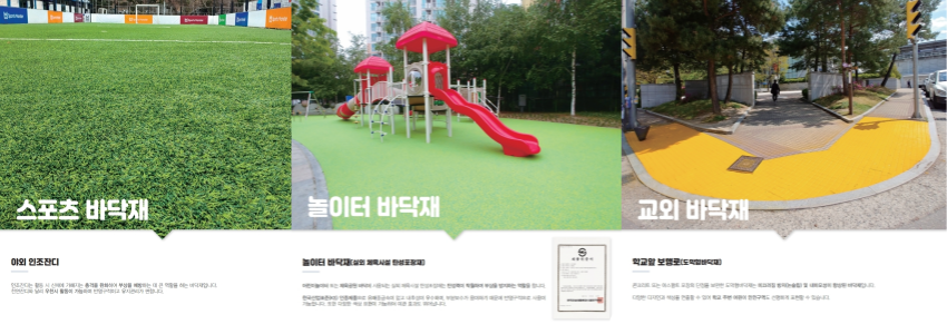 - ¾ß¿Ü ÀÎÁ¶Àܵð, À°»ó ·ÑÆ®·¢ µî, ½ºÆ÷Ã÷ ¹Ù´ÚÀç - ź¼º·ÂÀÌ Å¹¿ùÇØ ºÎ»óÀ» ¹æÁöÇϴ ź¼ºÆ÷ÀåÀç, ³îÀÌÅÍ ¹Ù´ÚÀç - ³í½½¸³ ¹× ³»¸¶¸ð¼ºÀÌ Çâ»óµÈ µµ¸·Çü¹Ù´ÚÀç, ±³¿Ü ¹Ù´ÚÀç